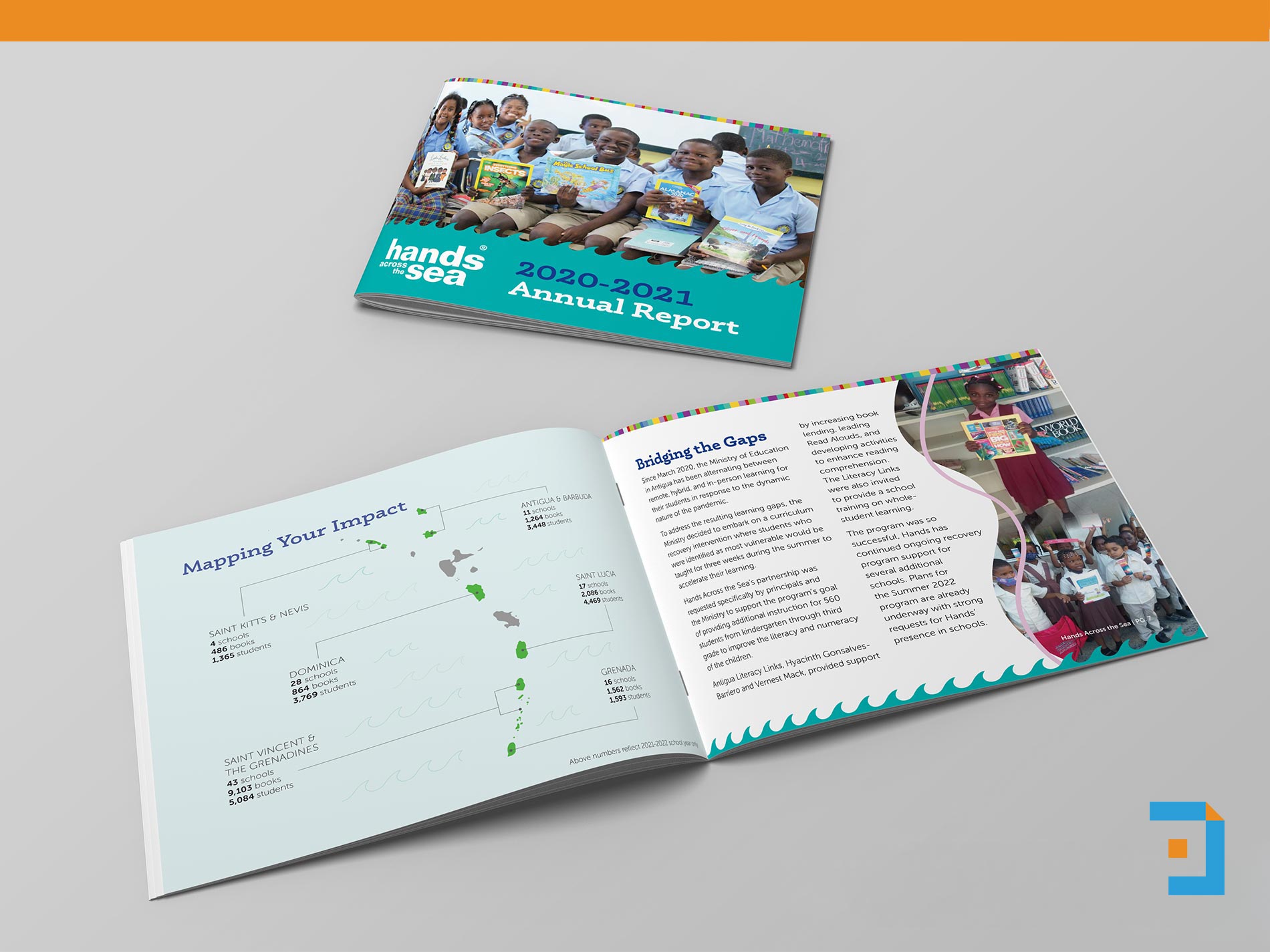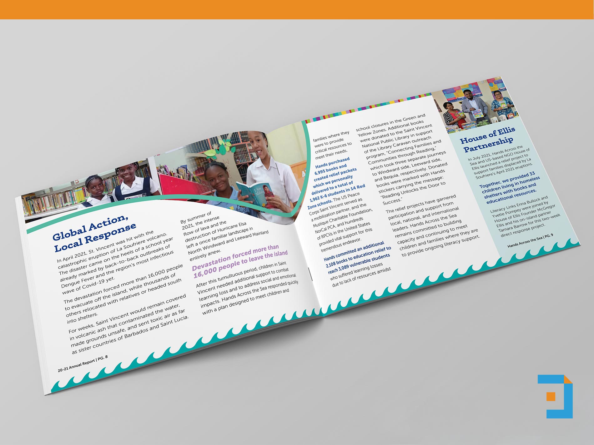 A vibrant, story-driven annual report for Hands Across the Sea, a nonprofit dedicated to getting books into the hands of children across the Caribbean. The report features bold color, playful typography, and engaging layouts that reflect the joy of reading while clearly communicating impact. To make the piece feel unexpected and inviting, the report was produced at a standard 8.5 × 11 size but bound in landscape, creating a story book-like reading experience that supports storytelling and visual flow. Photography, illustrations, and data are woven together to create a report that feels accessible, hopeful, and centered on children and community impact.