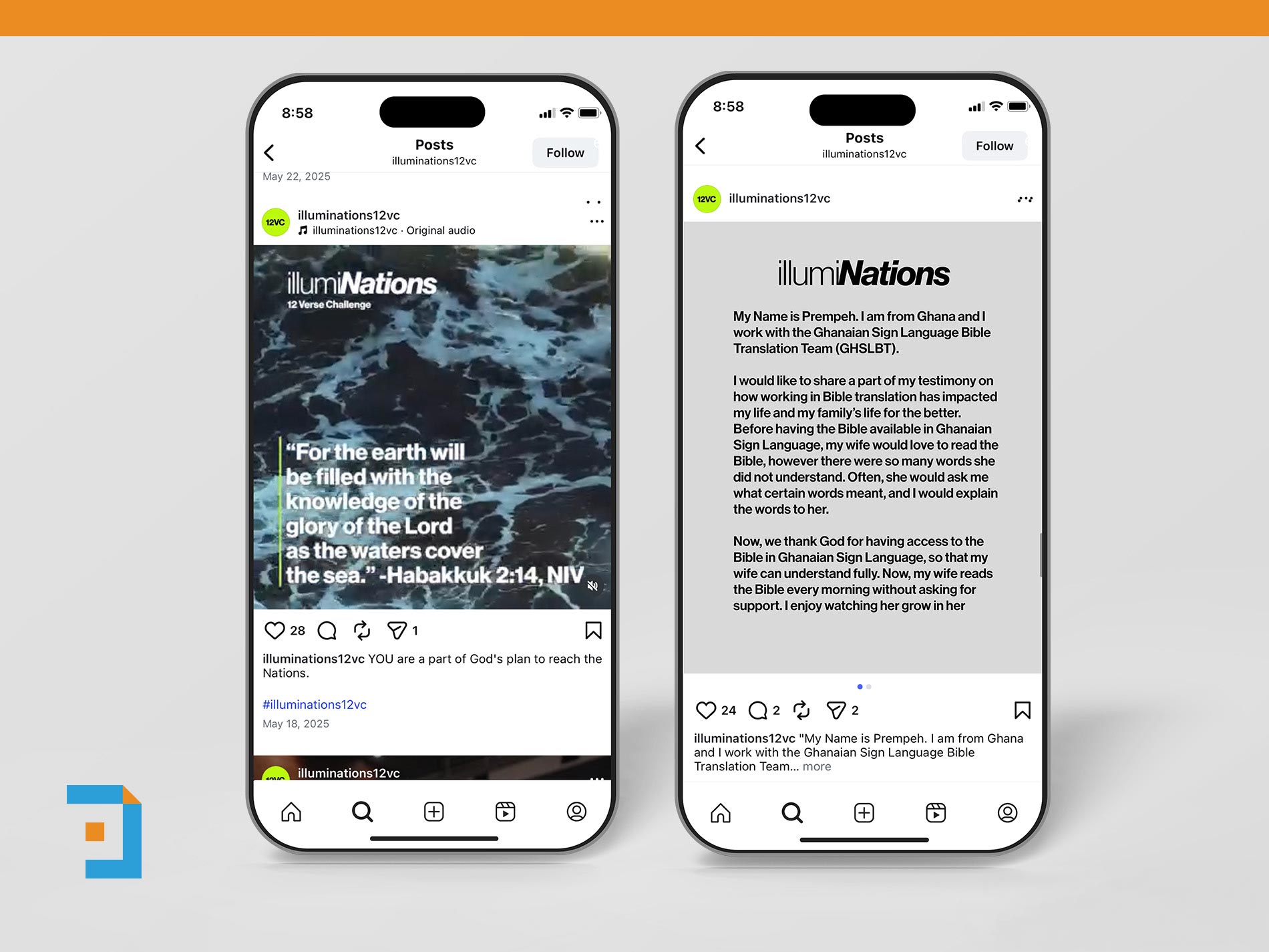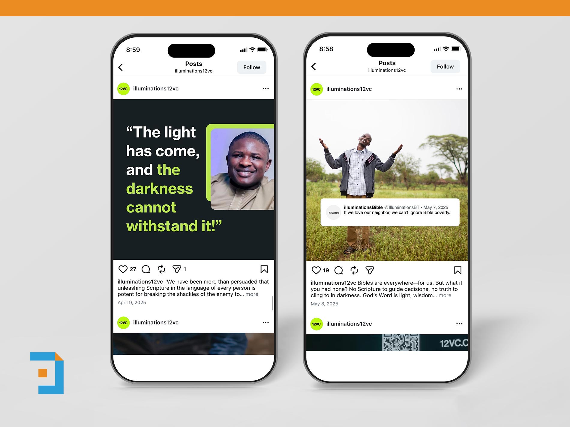 A series of on-brand social media graphics for Illuminations’ 12 Verse Challenge, an initiative highlighting the importance of Bible translation for people groups without access to Scripture. The graphics were created to vary in layout and visual treatment while maintaining a consistent look and feel across the campaign. Each piece communicated the impact and urgency of Bible translation in a clear, approachable way, helping audiences understand both the need and the mission behind the challenge.